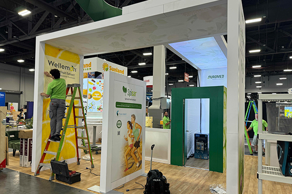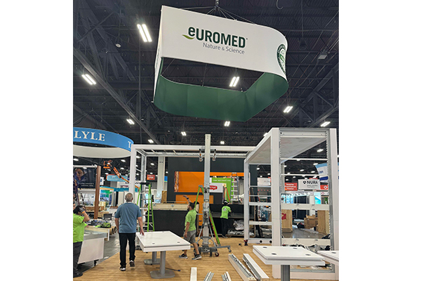 Designed by Xhibit Solutions and produced by Classic Exhibits, the custom Euromed exhibit was a sophisticated build at SupplySide Global. The On Location Las Vegas team expertly installed every unique component – from illuminated lightboxes and backlit ceiling to a fully enclosed conference room and reception counter.